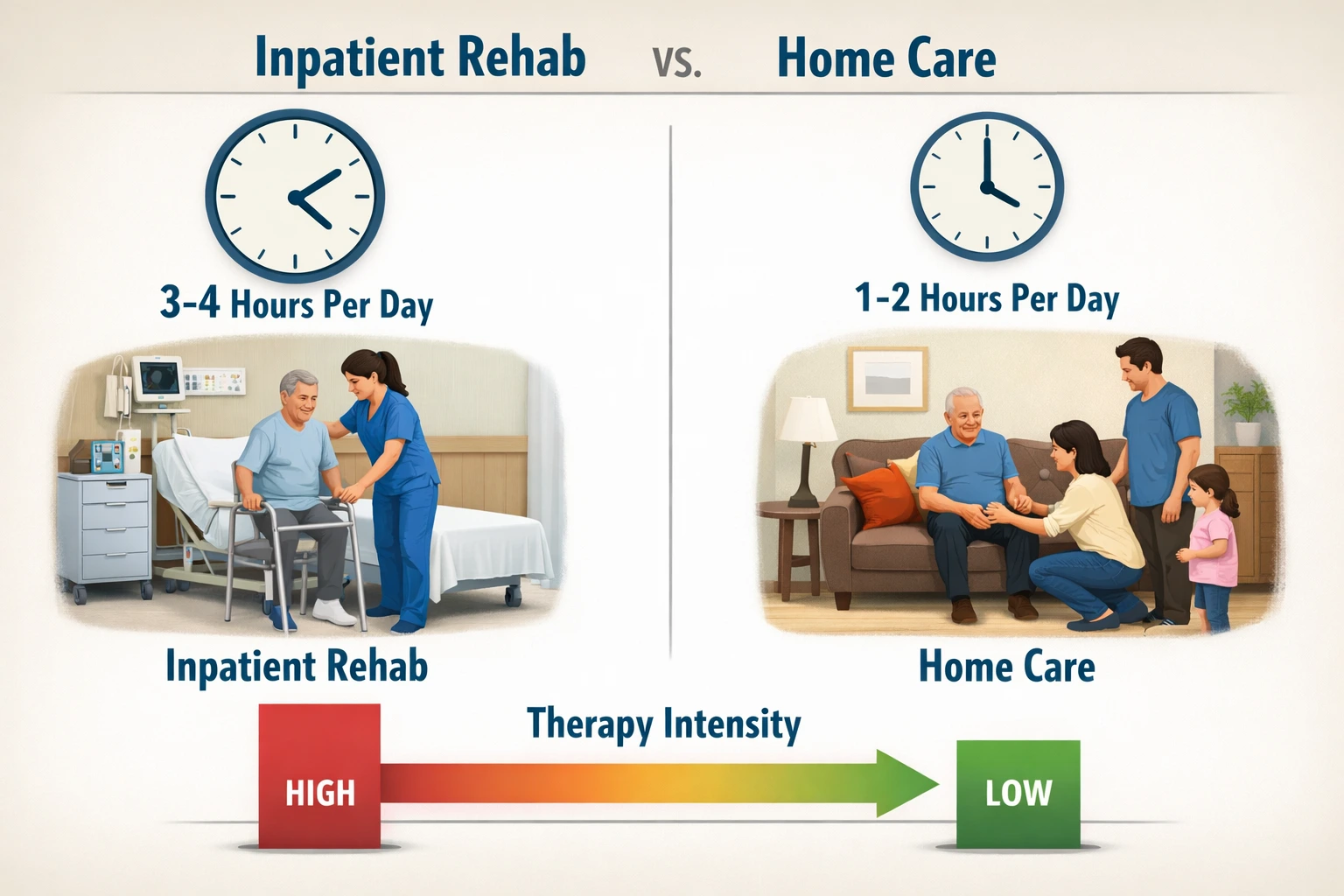 As you explore rehabilitation options for your loved one, it’s important to understand the difference between inpatient care and home care, as well as which might be best suited to their needs.