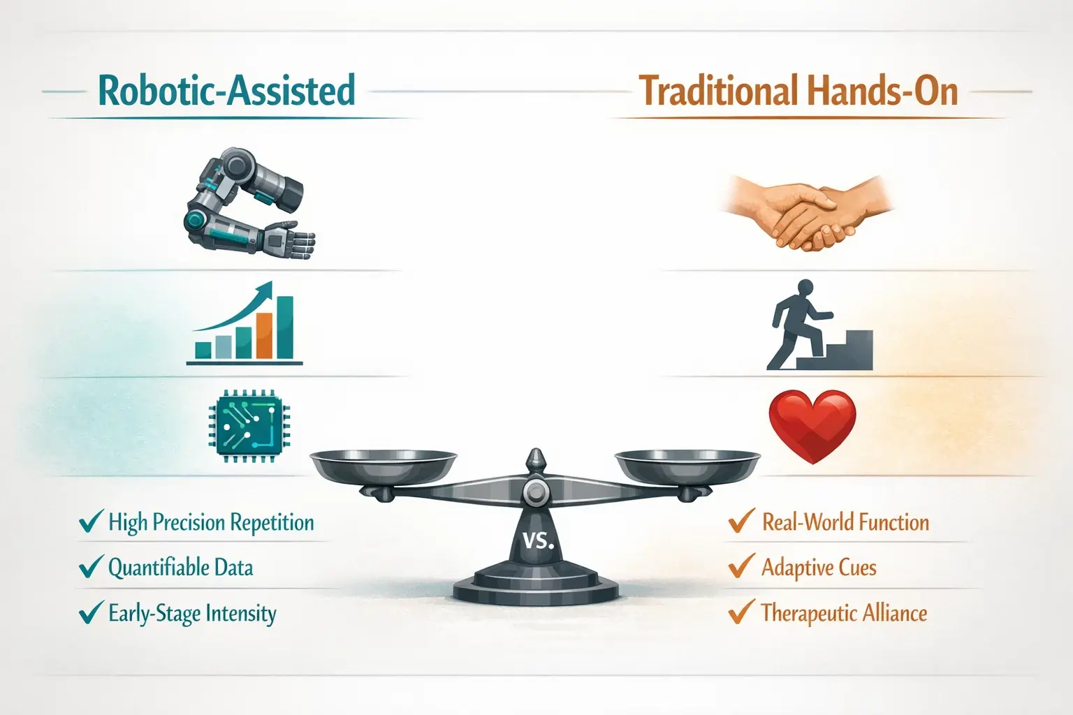 The core difference? Traditional therapy trains your brain-in-context. Robotic therapy trains your muscles and nerves with precision.